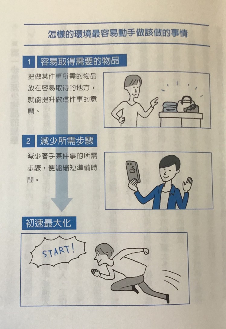 讓自己在最短時間內開始做一件事,打造一個讓人容易著手做事的環境。決定這個地方要用來做什麼,就依目的擺放必需物品。