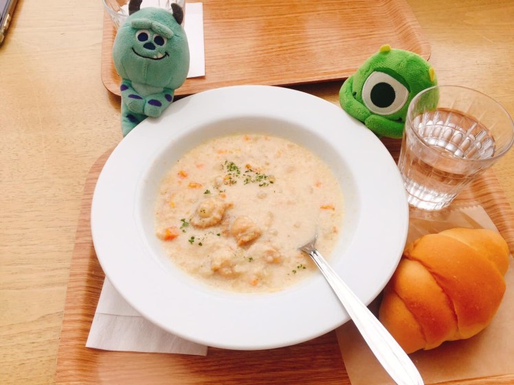 冷冷的天,進入溫暖的室內,就忍不住想吃點熱熱的,尤其是我的胃,剛剛受到冷牛舌飯糰的催殘,真的很渴望有熱熱的湯可以溫暖一下身體,所以我點了陸奧海產扇貝奶油濃湯,配上餐包。