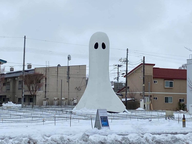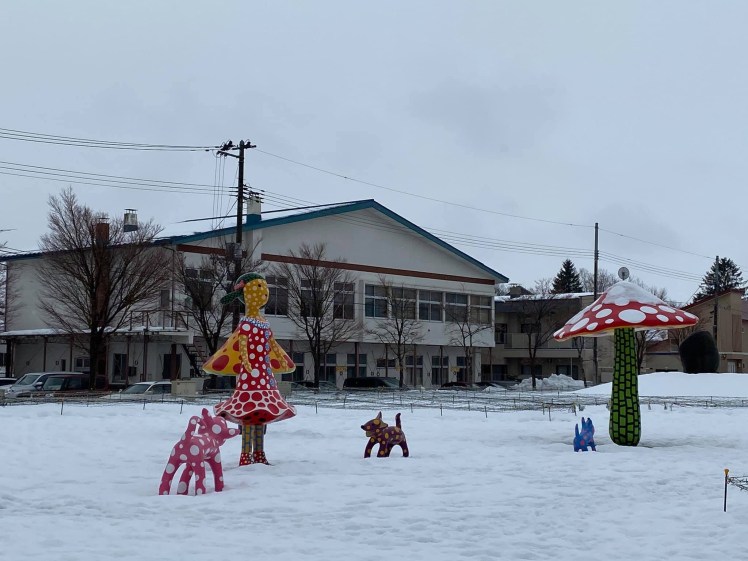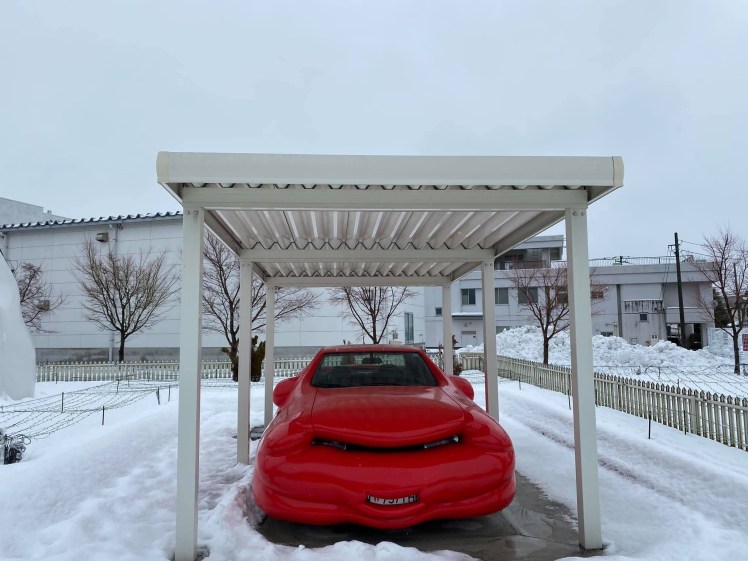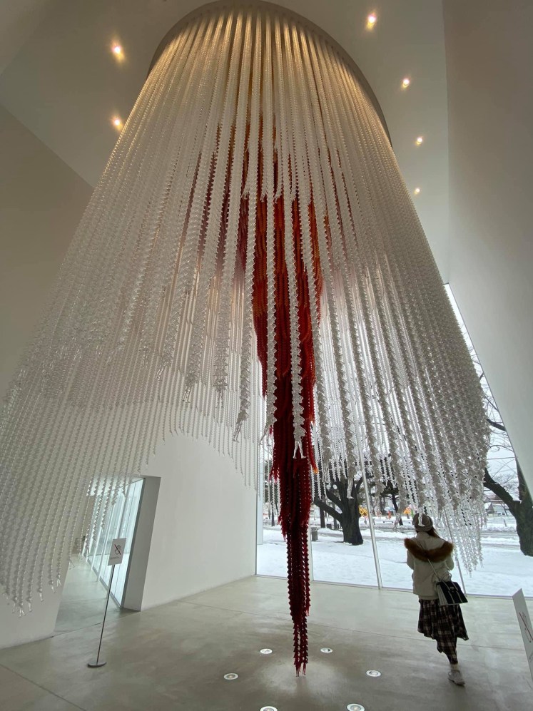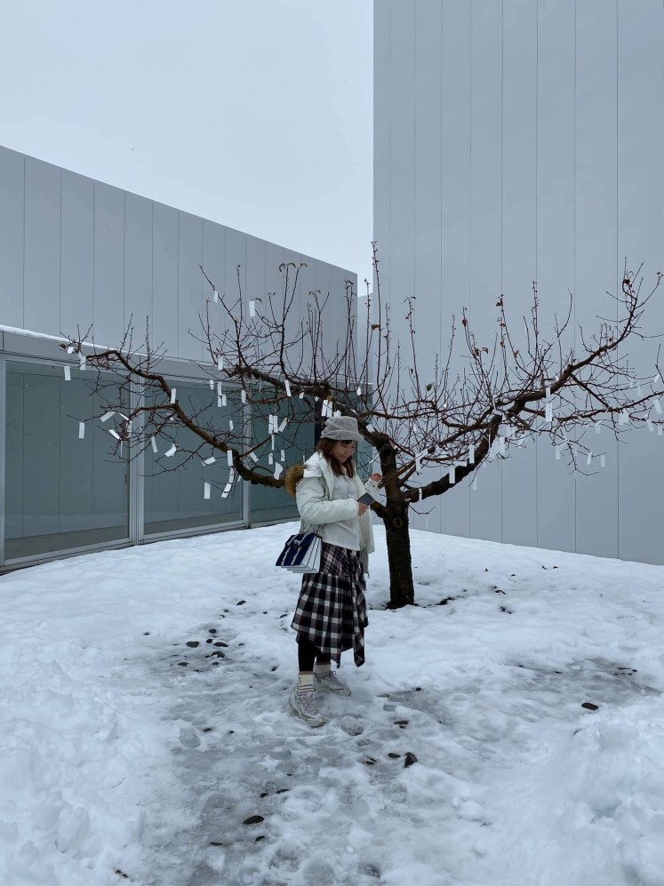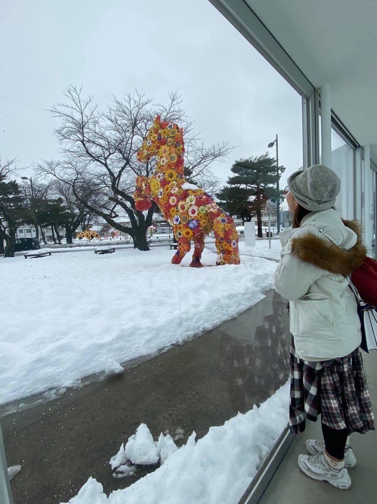 看到這些巨大的雕塑作品,就抵達十和田現代美術館了。外面飄起了小雪,撐起傘,還是玩玩雪再進入美術舘。