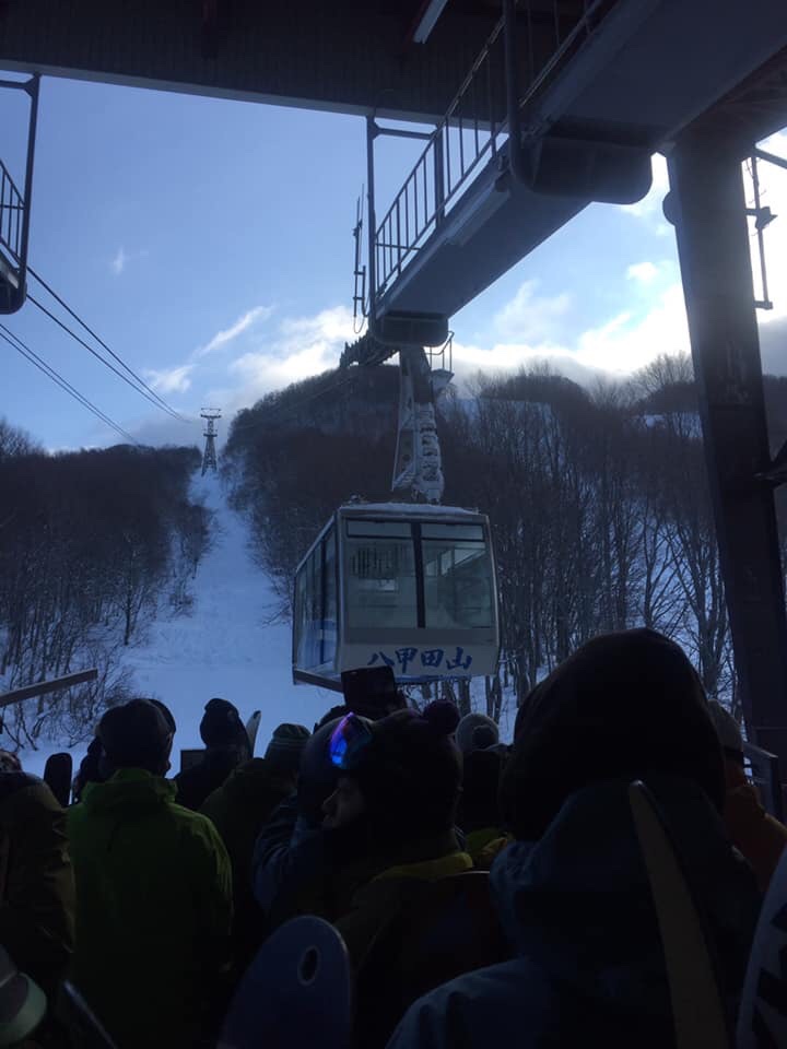 穿上裝備,走上二樓準備搭攬車。整個樓梯上,滿滿都是全幅武裝帶著雪撬準備滑雪的人們。像我們這種純看樹冰的,真的是少數稀有人。