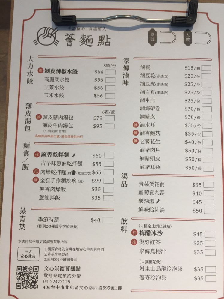 內用的菜單,「湯包」只提供內用,所以內用別忘了點湯包,皮薄多汁肉鮮嫩!還可以跟店員要求薑絲搭配著吃。