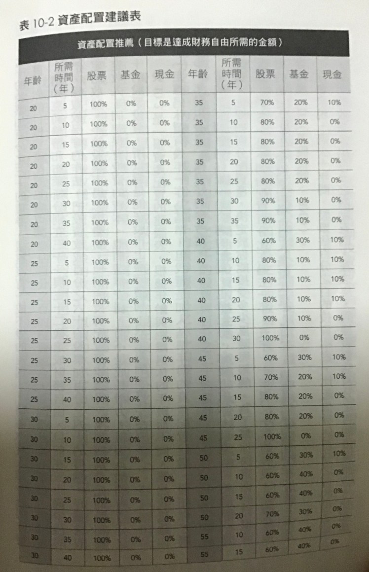三、決定目標資產配置:距離退休越遠,投資期限愈長,你的目標資產配置承受的風險就應該越高,所以股票配置的百分比也應該越高,例如,100%股票,或是90%股票+10%債券。