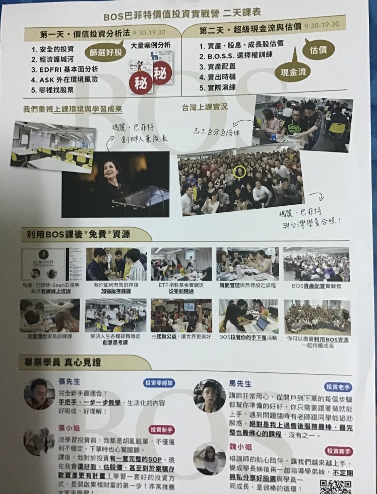 爬文研究中發現,原來Bos是一家教大家做美股價值投資的公司,雖然我是急性子行動派人物,看到一堆學長姐的文章介紹,已經打定主義,不管Bos課程費用多少,我絶對要去上課,因為與其自己摸索、浪費時間、不如花錢上課,反而更省時省錢又省力。
