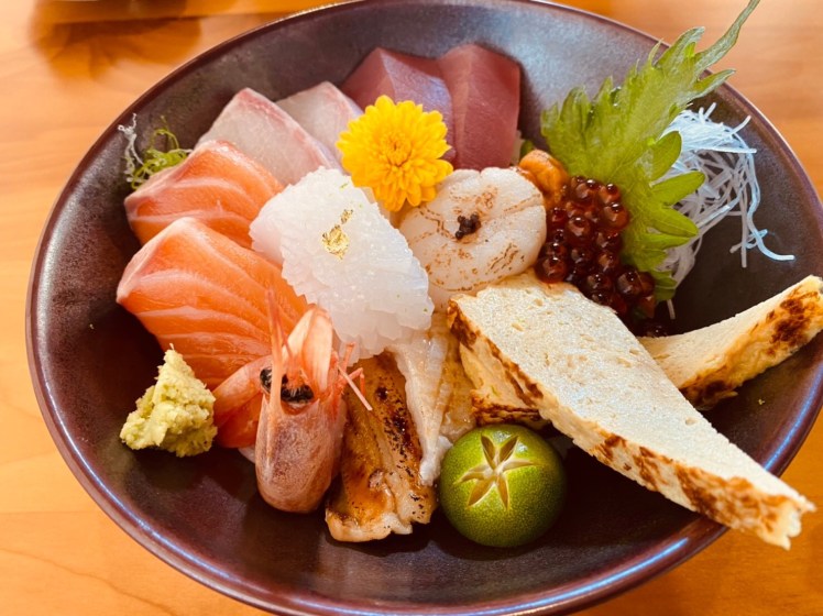 極上盛合海鮮丼,它和盛合海鮮丼的差別在於,盛合海鮮丼有蟹膏,但是極上盛合沒有蟹膏,卻有甜蝦、海膽、比目魚、星鰻!