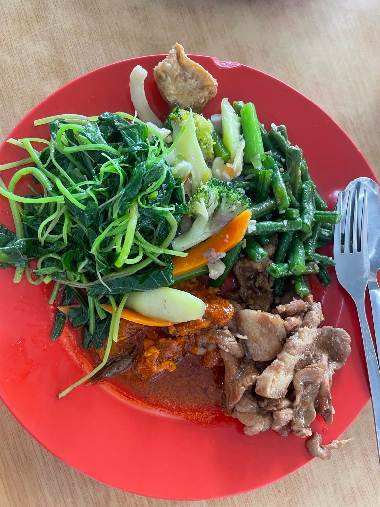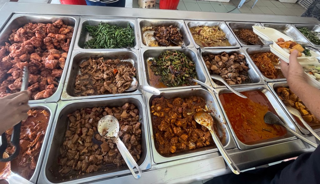 跟台灣一樣,領了盤子,看看要吃什麼菜,自己盛,盛好老闆會告訴你,多少$,也有供應茶水、湯,可以自己裝。