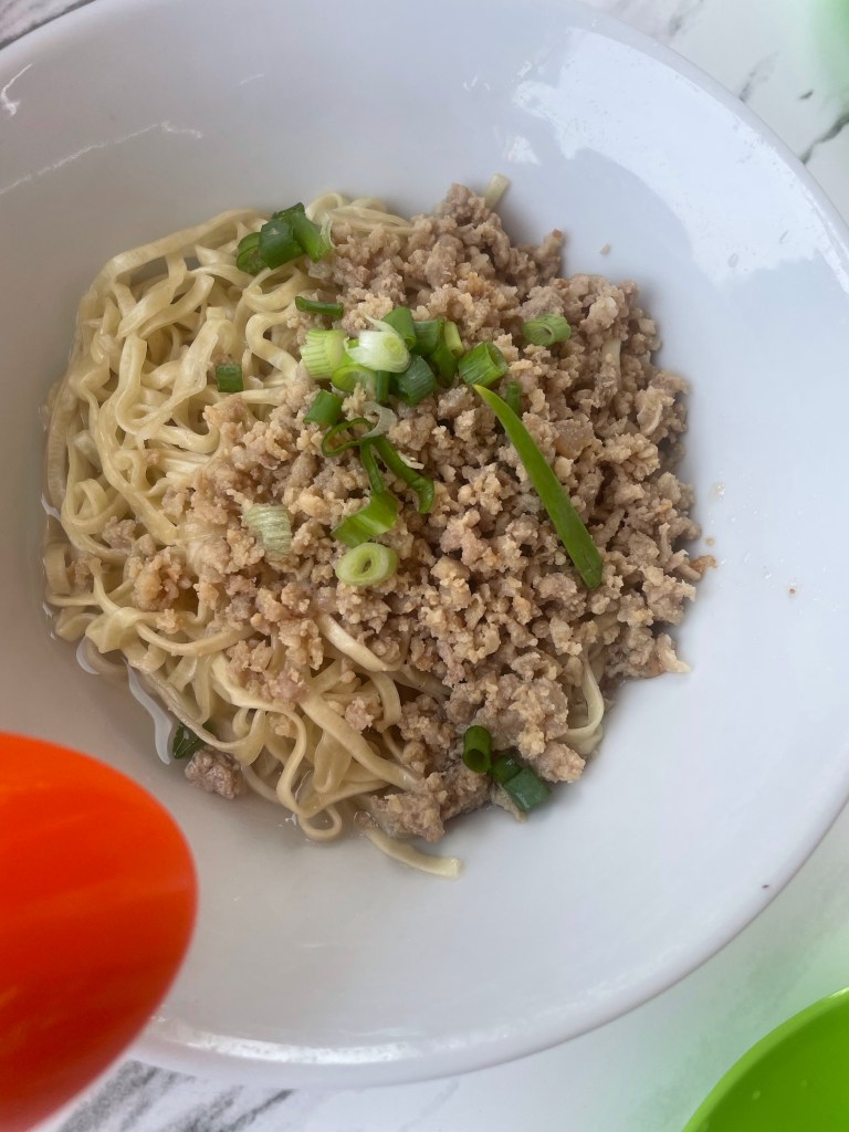 客家面的麵條,就像台南關廟的意麵,麵身扁扁的,卻又很Q彈有咬勁,上方放上碎絞肉和蔥花,是道簡單卻又好吃的餐點。